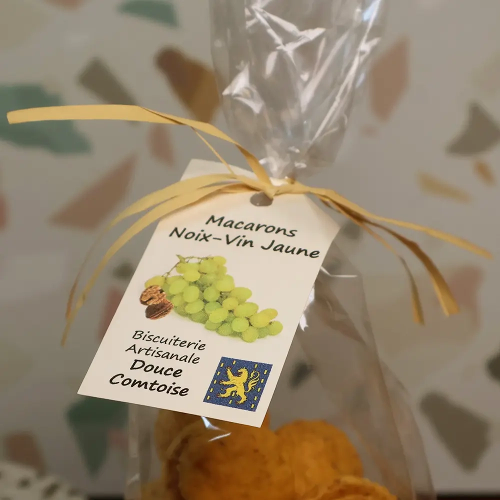 Les macarons Noix & Vin Jaune se distinguent par leur texture équilibrée. Leur croûte légèrement dorée révèle un cœur moelleux, fondant et parfumé. Cette texture artisanale, à mi-chemin entre le biscuit et la confiserie, séduit dès la première bouchée. Contrairement aux macarons de pâtisserie à coque lisse, ceux de la Douce Comtoise conservent une identité plus rustique et authentique, fidèle à la tradition régionale.