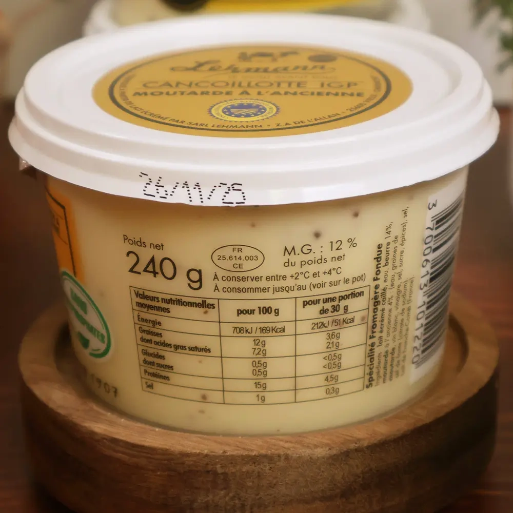 Symbole culinaire du Jura, la cancoillotte est appréciée pour sa texture fondante et son goût léger, ce qui en fait une base idéale pour accueillir des parfums variés. Dans cette version, l’ajout de moutarde apporte du caractère et une touche relevée, tout en respectant l’équilibre des saveurs.