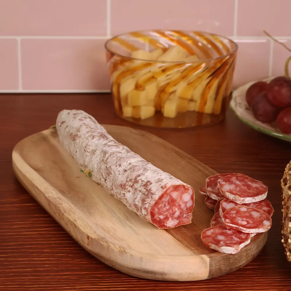 Utilisation : coupez-le en fines tranches et servez-le avec quelques cornichons croquants, des noix et un bon pain de campagne. Le Comté contenu dans le saucisson crée un duo savoureux avec les arômes légèrement acidulés des pickles ou des moutardes à l’ancienne.